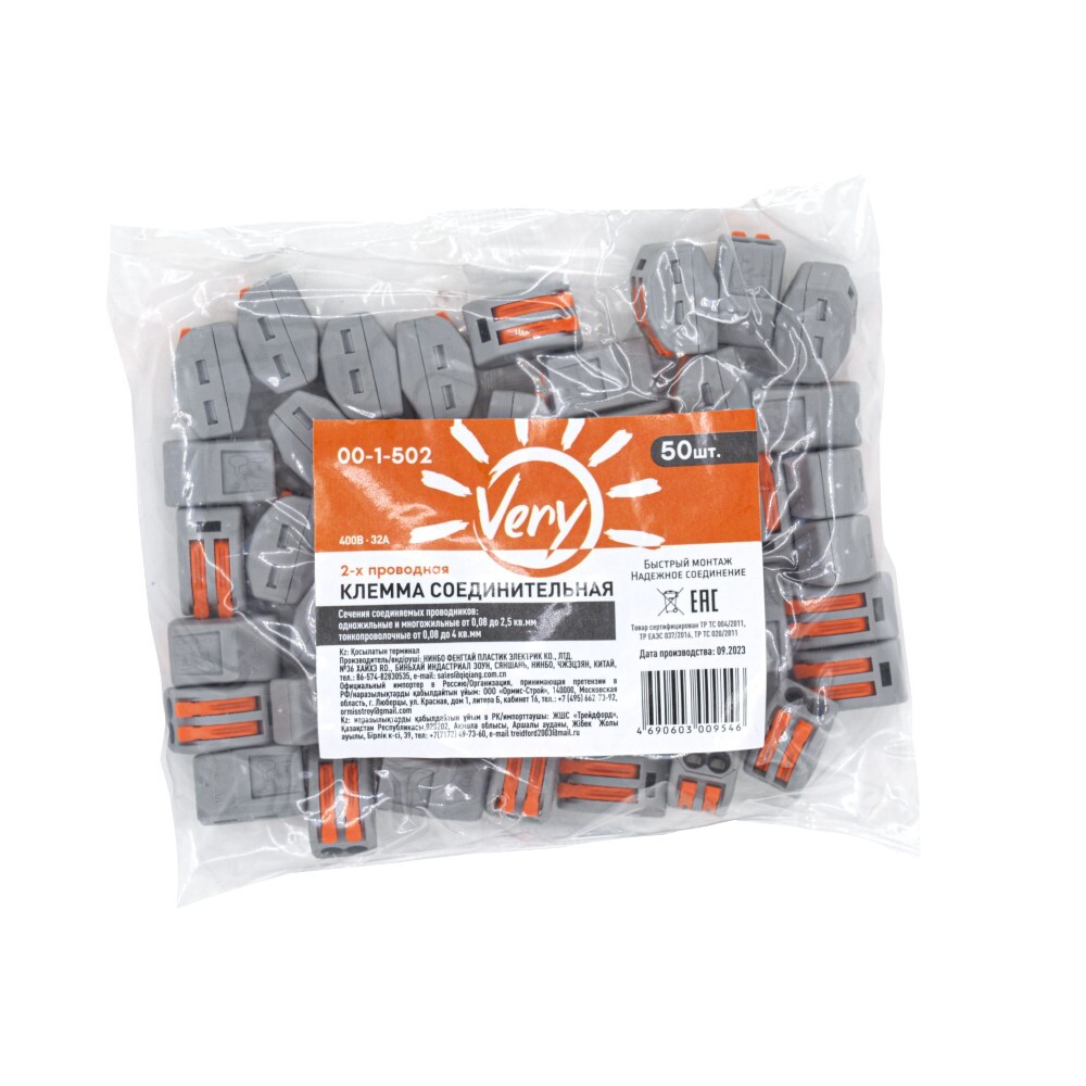 Профессиональные клеммы Very 00-1-502 обеспечивают надежное соединение двух проводов при напряжении до 400 В и токе до 32 А. Компактный размер и высокая прочность упрощают электромонтаж, обеспечивая безопасность эксплуатации электрооборудования. Пакет из 50 штук оптимален для бытовых нужд и небольших строительных проектов – вы всегда будете готовы к подключению новых устройств!