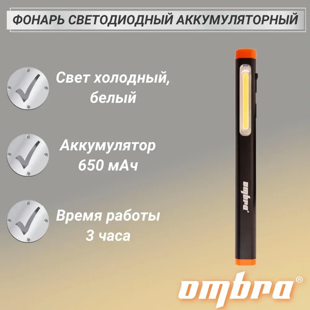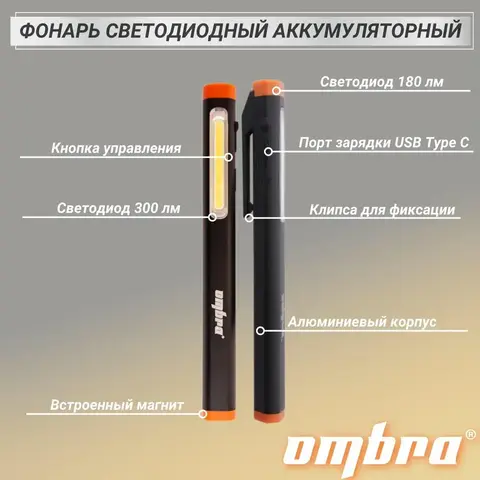Ombra A90065 — это надежный и компактный источник света, сочетающий высокую мощность (до 300 + 180 люмен) и удобство переноски. Благодаря встроенному аккумулятору, он обеспечивает продолжительное время работы без необходимости замены батареек. Фонарь выполнен из качественных материалов, отличается прочностью и надежностью конструкции, что делает его идеальным выбором как для бытового использования, так и профессионального применения при ремонте и строительстве.