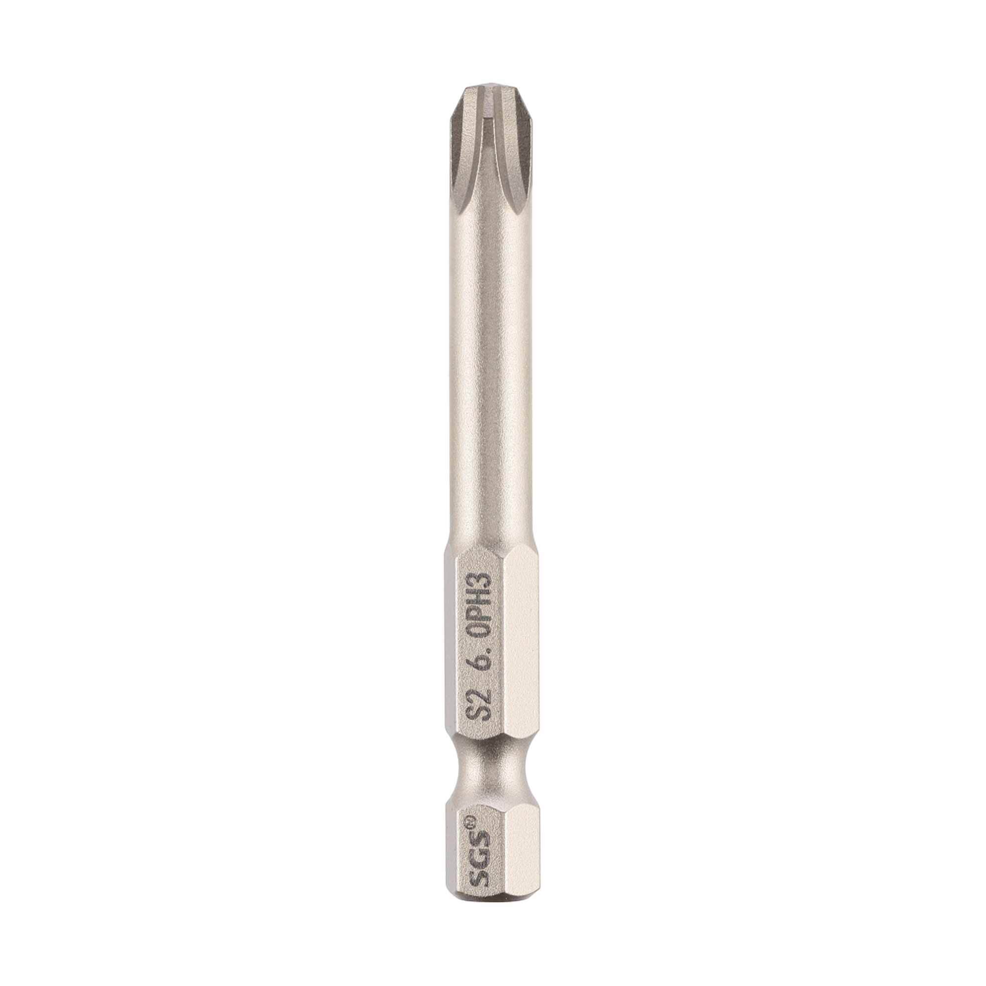 Комплект бит SGS 6350-6.0-PH3-5 включает 5 высококачественных насадок из хром-ванадиевой стали марки S2 с никелевым покрытием и крестовым шлицем PH3 глубиной 50 мм.