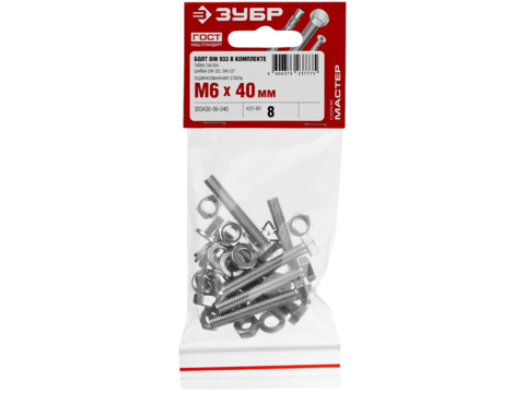 ЗУБР DIN 933, M6 х 40 мм, цинк, 8 шт, болт с гайкой и шайбами (303436-06-040)