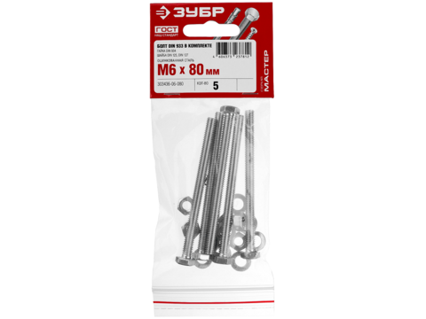 ЗУБР DIN 933, M6 х 80 мм, цинк, 5 шт, болт с гайкой и шайбами (303436-06-080)