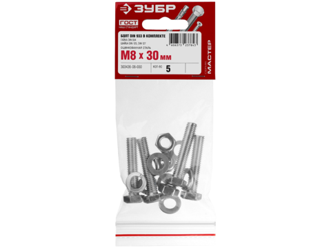 ЗУБР DIN 933, M8 х 30 мм, цинк, 5 шт, болт с гайкой и шайбами (303436-08-030)