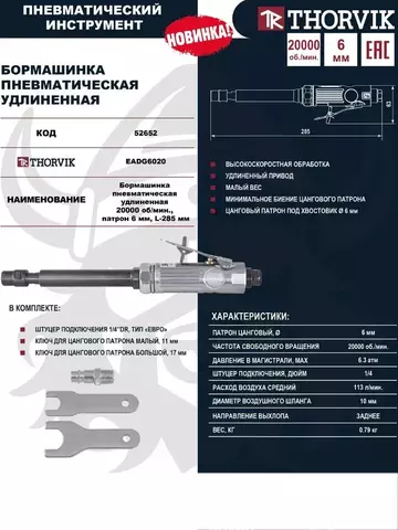 Пневматическая удлиненная бормашинка Thorvik EADG6020 52652 - это прибор, который работает на сжатом воздухе, который сконструирован для выполнения шлифовально-зачистных работ. Удлиненный и узкий корпус - для обработки поверхностей даже в труднодоступных местах.