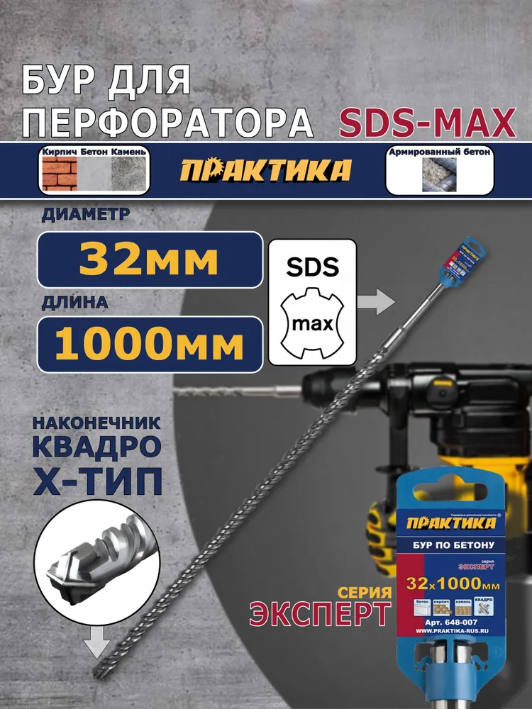 Бур Практика серии Эксперт — профессиональный инструмент для работы с бетонными поверхностями! Оснащен системой крепления SDS-MAX, длина рабочей части составляет внушительные 860–1000 мм, диаметр 32 мм. Материал изготовления обеспечивает долговечность и надежность при интенсивных нагрузках. Идеально подходит для сложных задач ремонта и строительства. Сделано в Китае. Подходит для дрелей и перфораторов соответствующего стандарта. Наслаждайтесь качеством бренда «Практика» уже сегодня!