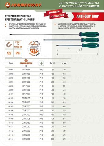 Отвертки серии "D71" "ANTI-SLIP GRIP" JONNESWAY® изготовлены в соответствии с требованиями стандарта DIN 5262, отвечают техническим условиям ГОСТ 17199-88. Намагниченные рабочие части, изготовленные из кремнийхромованадиевой стали, легко и надежно удерживают крепеж, что делает инструмент удобным при работе в труднодоступных местах. Двухкомпонентная, эргономичная рукоятка с мягким, устойчивым к нефтепродуктам и кислотам сантопреновым покрытием обеспечивает надежный хват, практически исключающий проскальзывание инструмента в руке оператора.