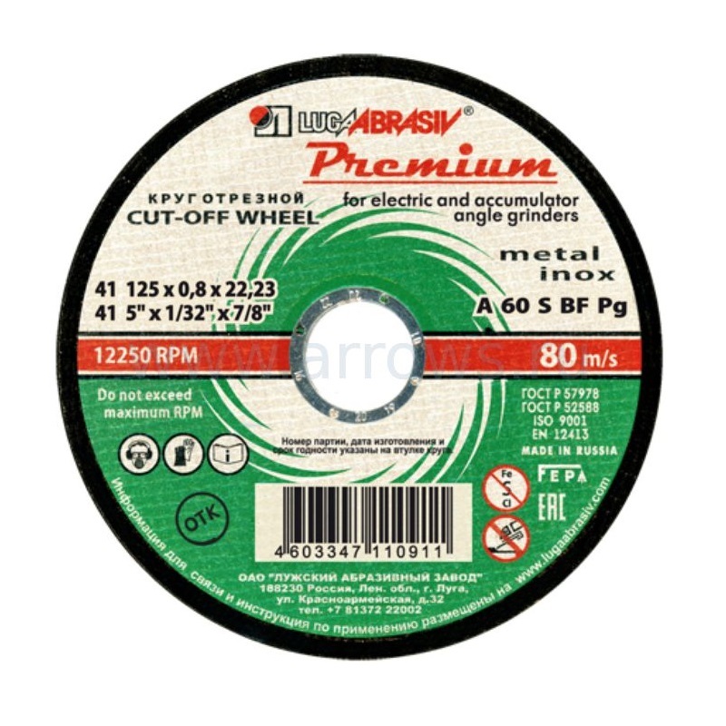 Диск абразивный отрезной по металлу Луга-Абразив Premium 125 x 0.8 x 22мм +нерж (400/25шт)