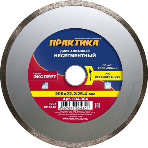 Диск алмазный несегментный ПРАКТИКА "Эксперт-керамогранит" 200 х 25,4/22 мм, (1 шт.) короб (034-304)
