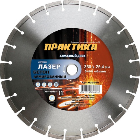 Диск алмазный сегментный ПРАКТИКА "Лазер-45-Бетон" 350 х 25,4 мм, сегмент 10мм коробка (030-078)