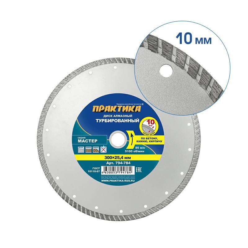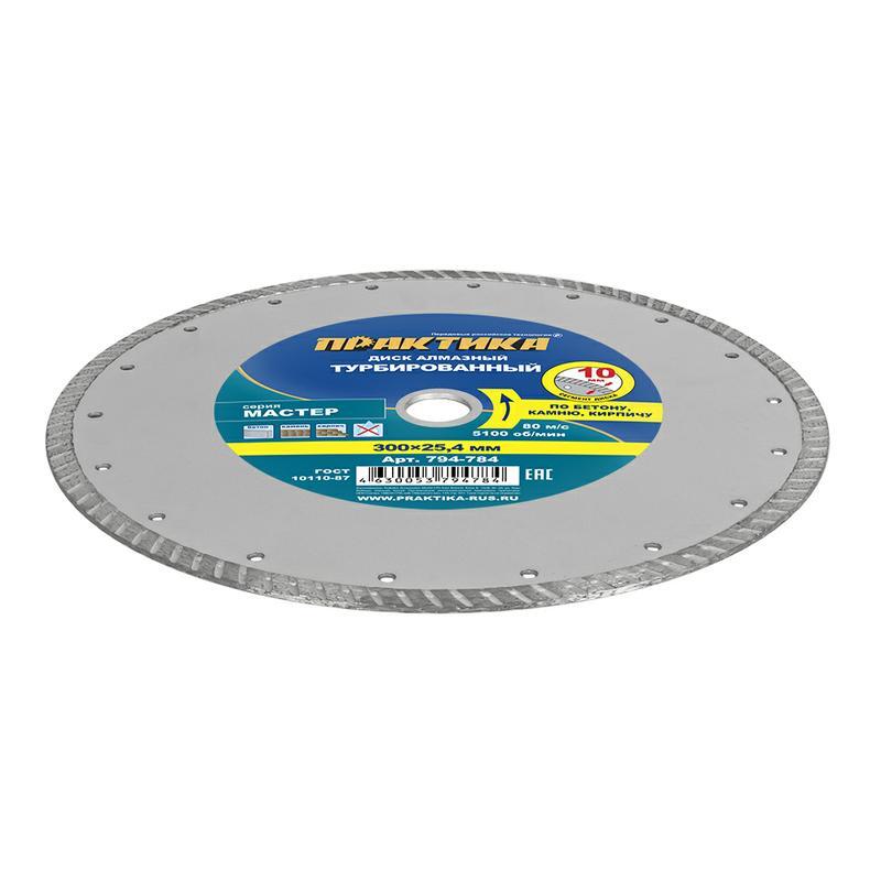 Диск алмазный турбированный Мастер (300x25.4/20 мм) ПРАКТИКА 794-784 предназначен для ручных резчиков. Применяется для сухого реза кирпича, бетона, искусственного и натурального камня, ЦСП, стекломагнезитовых листов.