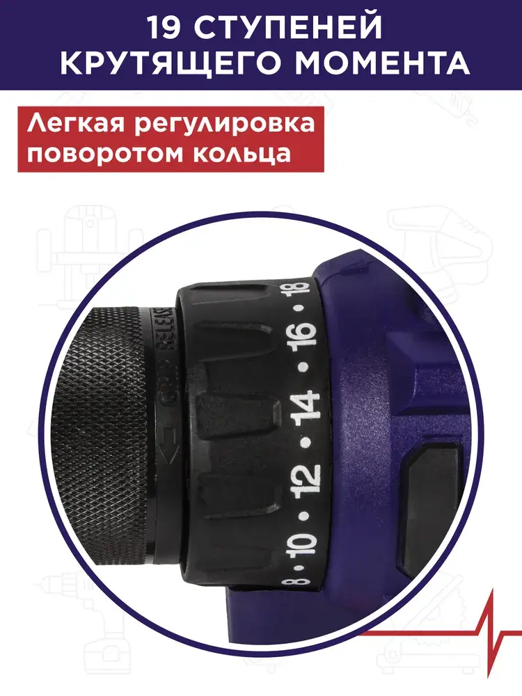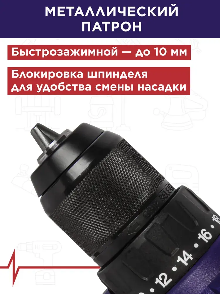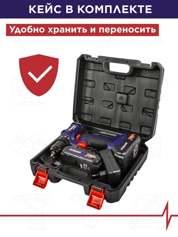 Аккумуляторная дрель "ПУЛЬСАР" — это надежный инструмент для сверления отверстий и заворачивания крепежа. Мощность двигателя составляет 18 В, а крутящий момент достигает 45 Нм, что обеспечивает высокую производительность работы. Литий-ионный аккумулятор емкостью 2 А·ч позволяет работать продолжительное время без подзарядки.