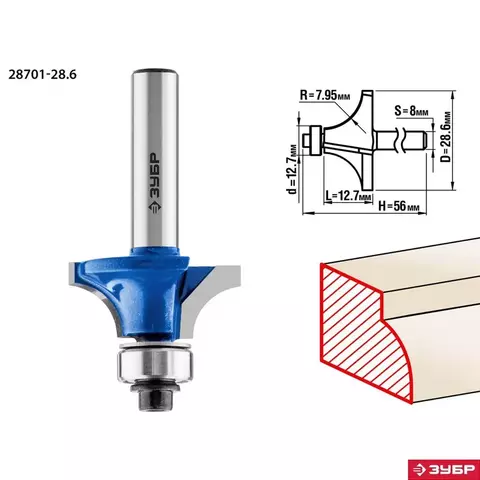 ЗУБР 28.6 x 12.7 мм, радиус 7.95 мм, фреза кромочная калевочная №1 28701-28.6 Профессионал.