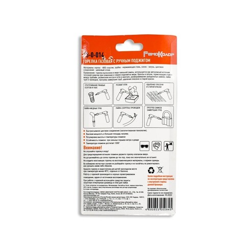 Корпус - ABS-пластик, трубка - нержавеющая сталь, сопло - латунь, цанговое соединение - цинковый сплав. Горелка используется как автономный источник тепловой энергии при плавлении и сварке изделий из стекла и пластика, для разжигания костра и угля в мангале, размораживания заледенелых замков, пайки и разогрева различных предметов, декорирования кулинарных изделий. Быстросъемное цанговое соединение (запатентованная технология). Регулировка высоты и температуры пламени; устойчивость пламени при сильных порывах ветра и дожде; температура пламени достигает 1300°.