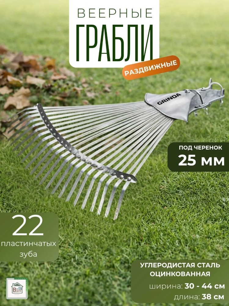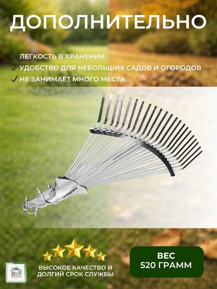 Представляем вам надежные и удобные веерные грабли от бренда GRINDA! Идеальный инструмент для ухода за садом и огородом. Усиленная конструкция обеспечивает долговечность, а 22 плоских зубца позволяют быстро и эффективно справляться с любыми задачами по обработке почвы. Сделайте свой труд легче и приятнее с инструментами GRINDA – ваш надежный помощник в саду!