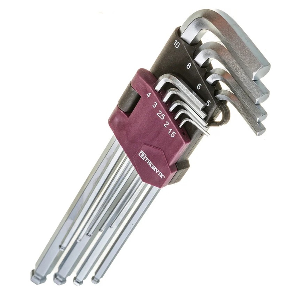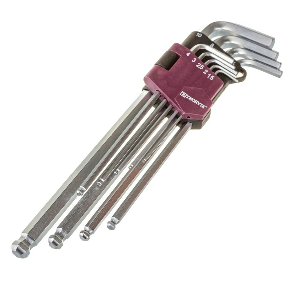 Профессиональный набор инструментов Thorvik HKLB9S включает 9 удлинённых шестигранников с шарами различного размера (от H1.5 до H10), обеспечивая удобство при работе даже в труднодоступных местах. Отличное качество исполнения, высокая прочность материалов и эргономичный дизайн позволяют значительно повысить эффективность труда – незаменимый помощник мастера!