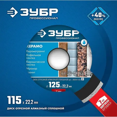 Диск отрезной алмазный сплошной 115 х 22.2 мм, ЗУБР 36654-115_z02, предназначен для резки керамической плитки, керамогранита, мрамора и других строительных материалов при обязательном водяном охлаждении. Корпуса алмазных кругов изготовлены из прочной легированной стали, способной выдержать значительную механическую нагрузку и высокую температуру. Оригинальная сплошная форма режущей кромки позволяет плавно и безударно осуществлять необходимые резы в обрабатываемом материале и обеспечивает чистый и аккуратный рез без трещин и сколов. Высококачественные синтетические алмазы. Оптимально подобранные компоненты металлической связки с высотой сегмента в 7 мм гарантируют продолжительный рабочий ресурс круга при работе даже с самыми сложными в обработке материалами. Высокая скорость реза и увеличенный рабочий ресурс круга обеспечиваются особой технологией горячего спекания. Сплошная режущая кромка обеспечивает чистый и аккуратный рез.