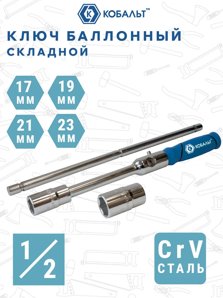 Ключ баллонный КОБАЛЬТ складной 17,19,21, 23мм, 1/2", CR-V, чехол (242-618) – предназначен для завинчивания/отвинчивания колесных гаек и болтов автомобилей с размерами гайки 17, 19, 21, 23мм.