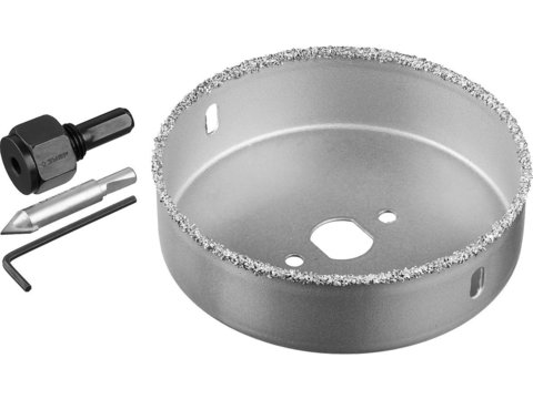 Коронка-чашка ЗУБР "ПРОФЕССИОНАЛ" c карбид-вольфрамовым нанесением, 102 мм, высота 25 мм, в сборе с державкой и сверлом 33360-102_z01, применяется при резке гипсокартона, кафельной и керамической плитки, кирпича, ячеистого бетона. Аккуратное сверление материала без трещин и сколов. Новейшая технология автоматического нанесения и спаивания твердосплавной крошки обеспечивает надежное соединение. Равномерное нанесение твердосплавных режущих элементов обеспечивает аккуратное сверление без трещин и сколов.