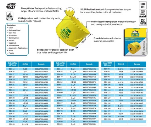 Зубья изготовлены из быстрорежущей стали с 8% содержанием кобальта HSSE-Co8(M42), а уникальная конструкция зубьев с положительным наклоном и шагом зуба 5,5 TPI обеспечивает гораздо более быструю и плавную резку всех материалов, требуя меньшего крутящего момента. Усиленная задняя часть корпуса коронки повышает прочность и снижает вибрацию, как следствие, срок службы коронки возрастает. Глубокие канавки между зубьями способствуют быстрому удалению стружки и предотвращению перегрева рабочей части коронки. Компенсационные прорези в корпусе обеспечивают снижение шума при работе, а также предотвращают деформацию пилы вследствие перегрева изделия.