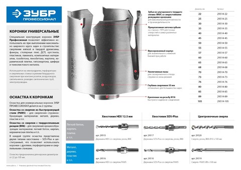 Универсальная коронка ЗУБР 29514-65, предназначена для решения разнообразных задач сверления при проведении строительных и ремонтных работ. Улучшенный твердый сплав повышает рабочий ресурс и стойкость режущих кромок. Фрезерованный корпус из высококачественной стали значительно сокращает возможные биения при работе. Специальный припой с содержанием серебра обеспечивает эффективное сопротивление ударным нагрузкам. Коронка подходит для сверления отверстий в легком бетоне, тонколистовом металле, кирпиче, керамической плитке, пластике, твердой и мягкой древесине.