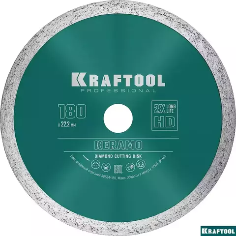 KRAFTOOL Ø 180Х22.2 мм, алмазный, сплошной, по керамограниту, керамической плитке диск отрезной KERAMO 36684-180.