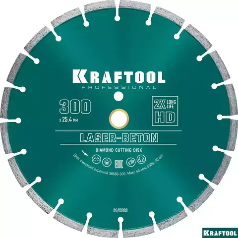 KRAFTOOL Ø 300Х25.4 мм, алмазный, сегментный, по бетону и камню, диск отрезной LASER-BETON 36686-300.
