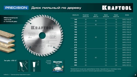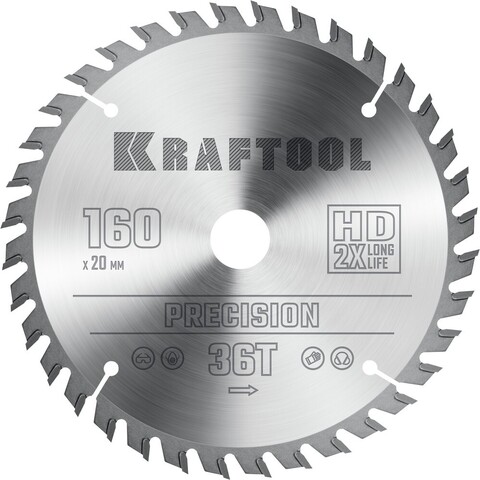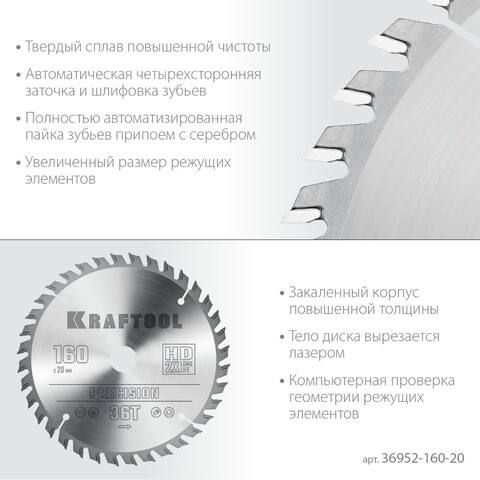 Пильный диск по дереву KRAFTOOL Precision 160x20 мм, 36т 36952-160-20 характеризуется максимальными показателями долговечности и эффективности пиления. Применяется для ручных циркулярных пил, торцовочных и станковых пил, для быстрых пропилов вдоль и поперек волокон в твердой и мягкой древесине, фанере, ДСП.
