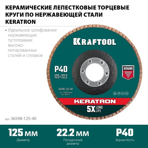 "Керамический лепестковый диск KRAFTOOL KERATRON 125х22,2 мм P40 — идеальный выбор для обработки нержавеющей стали! Высочайшая износостойкость (в 3 раза больше ресурса), защита от перегрева, отсутствие засаливания, повышенная прочность основы и эластичность лепестков обеспечивают профессиональное качество работы и удобство использования." Идеально подходит для сложных поверхностей и интенсивных нагрузок!"
