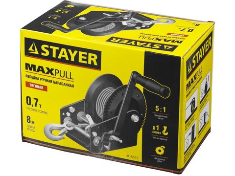 STAYER MAXPull, 0.7 т, 8 м, ручная барабанная тросовая лебедка (43112-0.7)