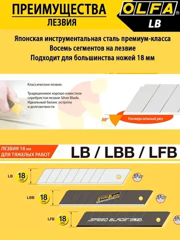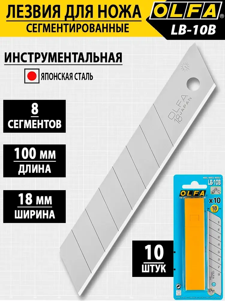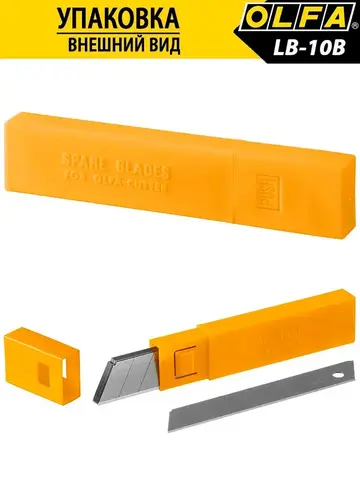 Лезвия OLFA OL-LB-10B, используются в качестве сменных рабочих элементов в ножах с шириной направляющей пластины 18 мм для разрезания различных материалов: линолеума, ковровых покрытий, гипсолитовых плит, гипсокартона, кровельных материалов, пластика, дерева.