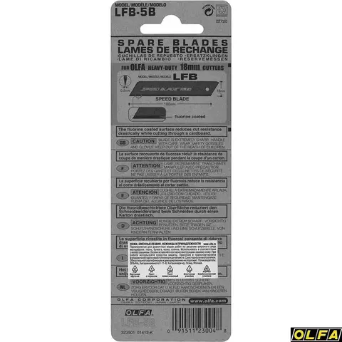 Лезвия OLFA OL-LFB-5B, используются в качестве сменных рабочих элементов в технических ножах соответствующего типа для разрезания различных материалов: линолеума, ковровых покрытий, гипсолитовых плит, гипсокартона, кровельных материалов, пластика, дерева.