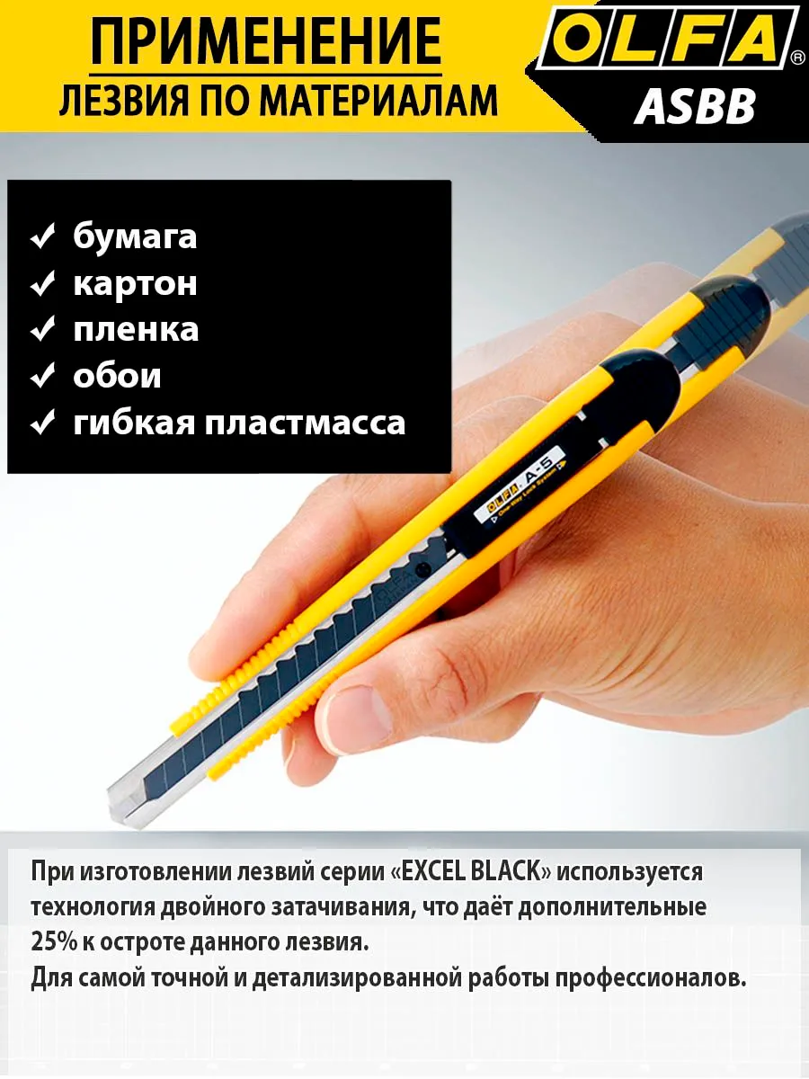 Лезвия серии "EXCEL BLACK" — вершина японской точности и надежности! Уникальная конструкция обеспечивает идеальный чистовой срез и комфортную работу. Созданы специально для тех, кто ценит профессионализм и эффективность каждого движения своего ножа!