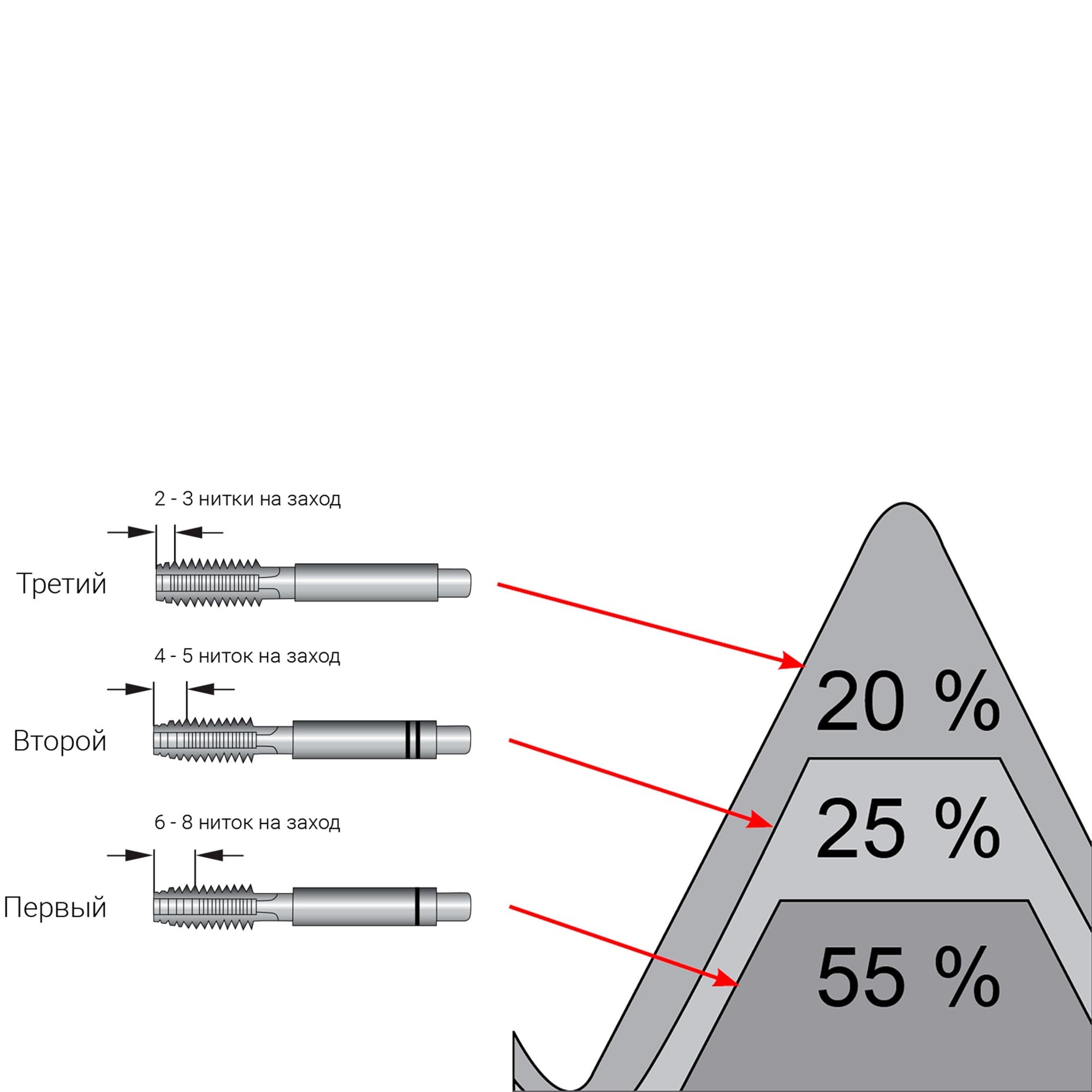 Формирование резьбы происходит в 3 этапа: сначала черновым метчиком №1 (6-8 ниток на заход), затем чистовым №2 (4-5 ниток на заход)и финишным (2-3 нитки на заход). Благодаря этому, снижается усилие, прилагаемое к каждому метчику, а получаемая резьба более точная и чистая.