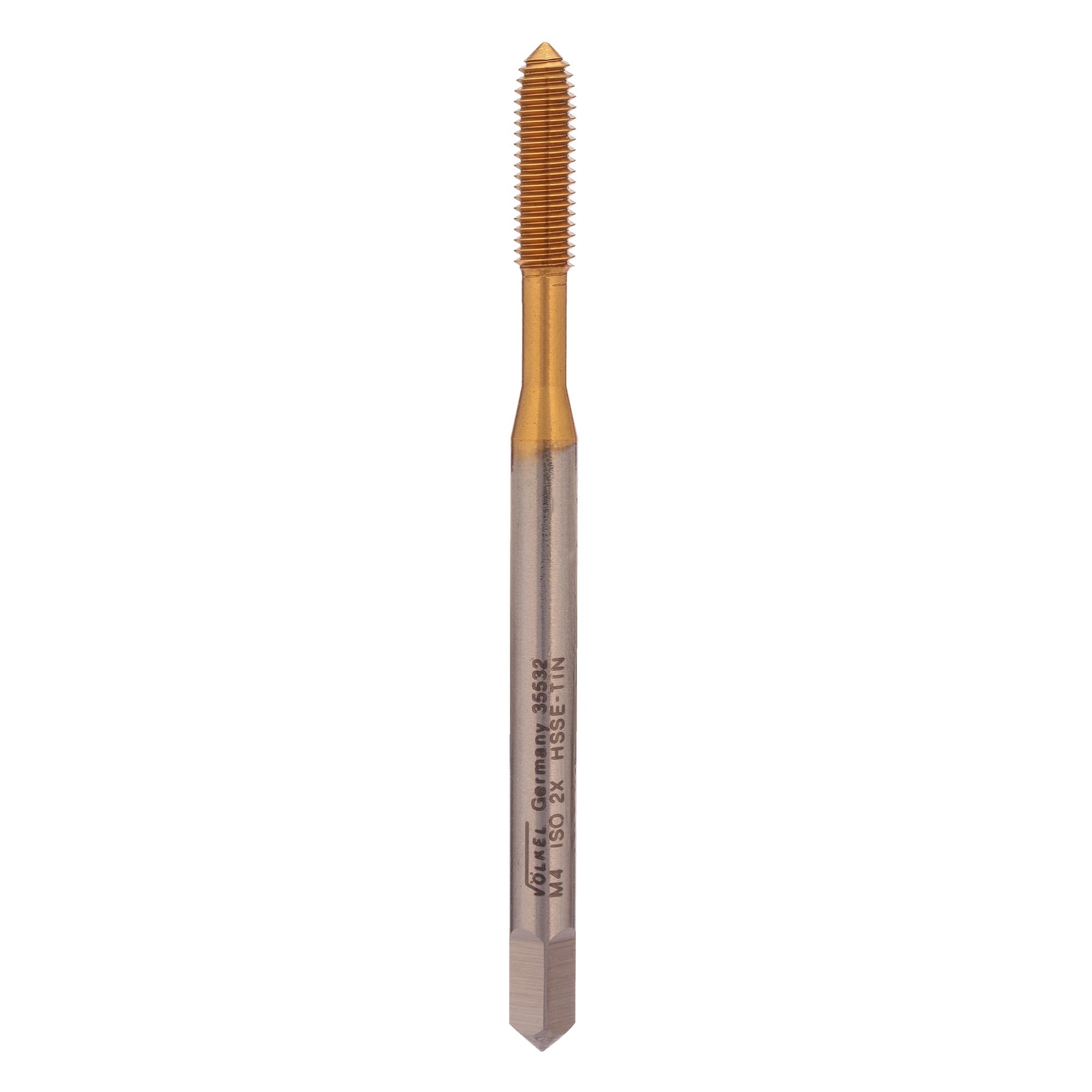 Метчик М 4,0х0,7 (Машинный, накатной) DIN371 HSSE-TiN 6HX C/2-3P 63мм a=3,4 Voelkel 35532 предназначен для создания внутренней резьбы в различных материалах. Метчик отличается от других тем, что в процессе изготовления резьбы происходит не резка материала, а его уплотнение тем самым не повреждается структура волокна. Не образуется стружка, а значит не требуется создание условий для ее отведения.