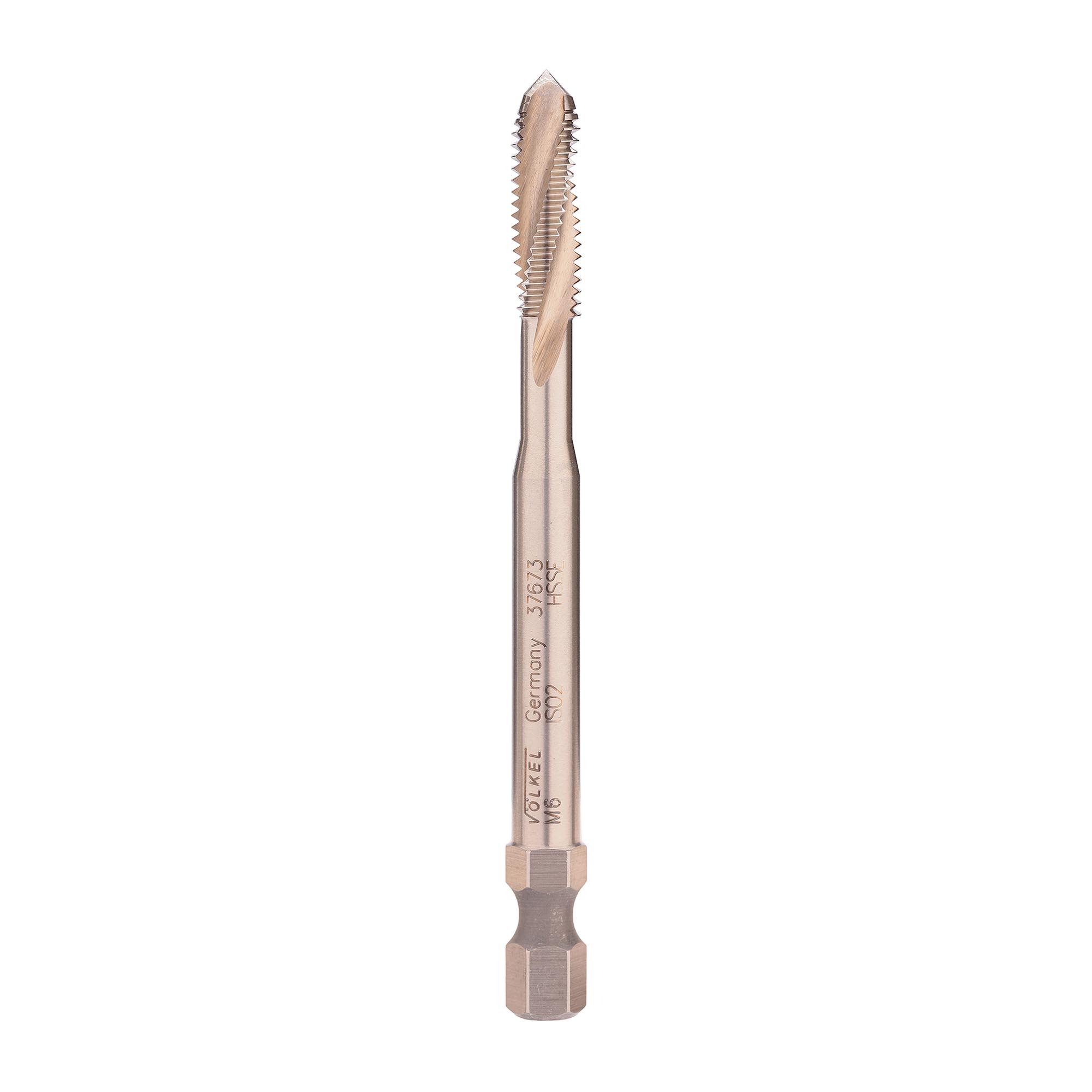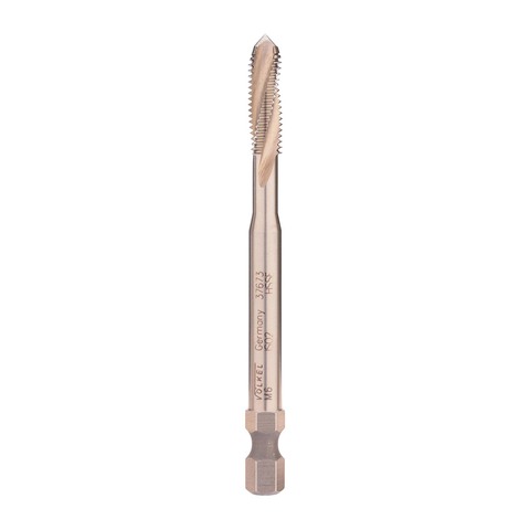 Метчик имеет 6-гранный хвостовик 1/4", что позволяет использовать в качестве держателя дрель-шуруповерт, а так же стандартные магнитные держатели для бит. Спиральная канавка с углом наклона 15° обеспечивает оптимальное стружкоудаление.