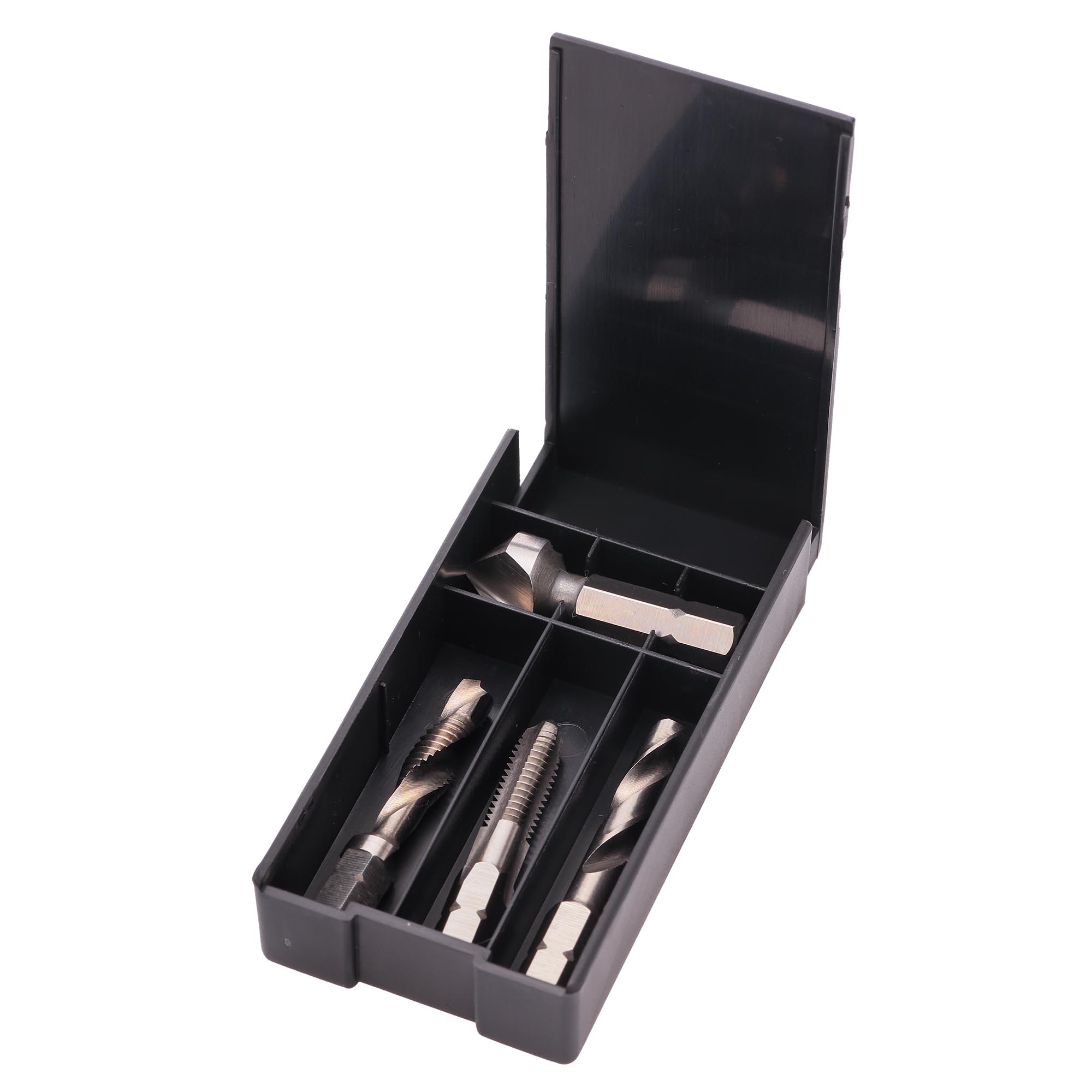 В комплект набора входит комбинированный метчик с помощью которого можно выполнять три операции за раз в заготовках небольшой толщины ( 1хD ) и только для сквозной резьбы.