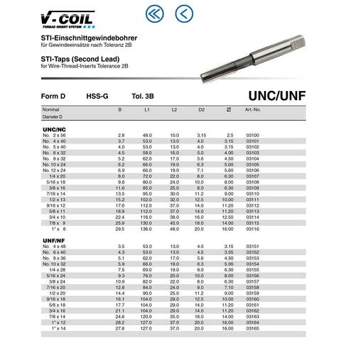 Метчик для вставки Volkel STI предназначен для создания дюймовой Американской резьбы UNF (Unified National Fine thread), с углом профиля 60 градусов только с допуском ISO2 (6H).