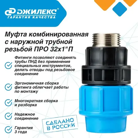 Муфта соединительная Джилекс с наружной трубной резьбой ПРО 32x1”П - надежное и качественное решение для вашей системы водоснабжения. Изготовлена из прочного материала, обеспечивает надежное соединение труб диаметром 32 мм. Проста в установке и эксплуатации, обеспечивает герметичность и долгий срок службы. Приобретая этот товар, вы получаете гарантию качества от известного бренда Джилекс.
