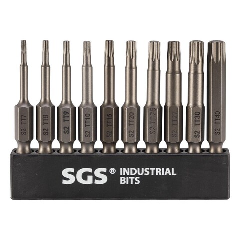 Набор бит TORX с отверстием SGS предназначен для работы с шуруповертами и отвертками с держателем при монтаже и демонтаже специального крепежа.