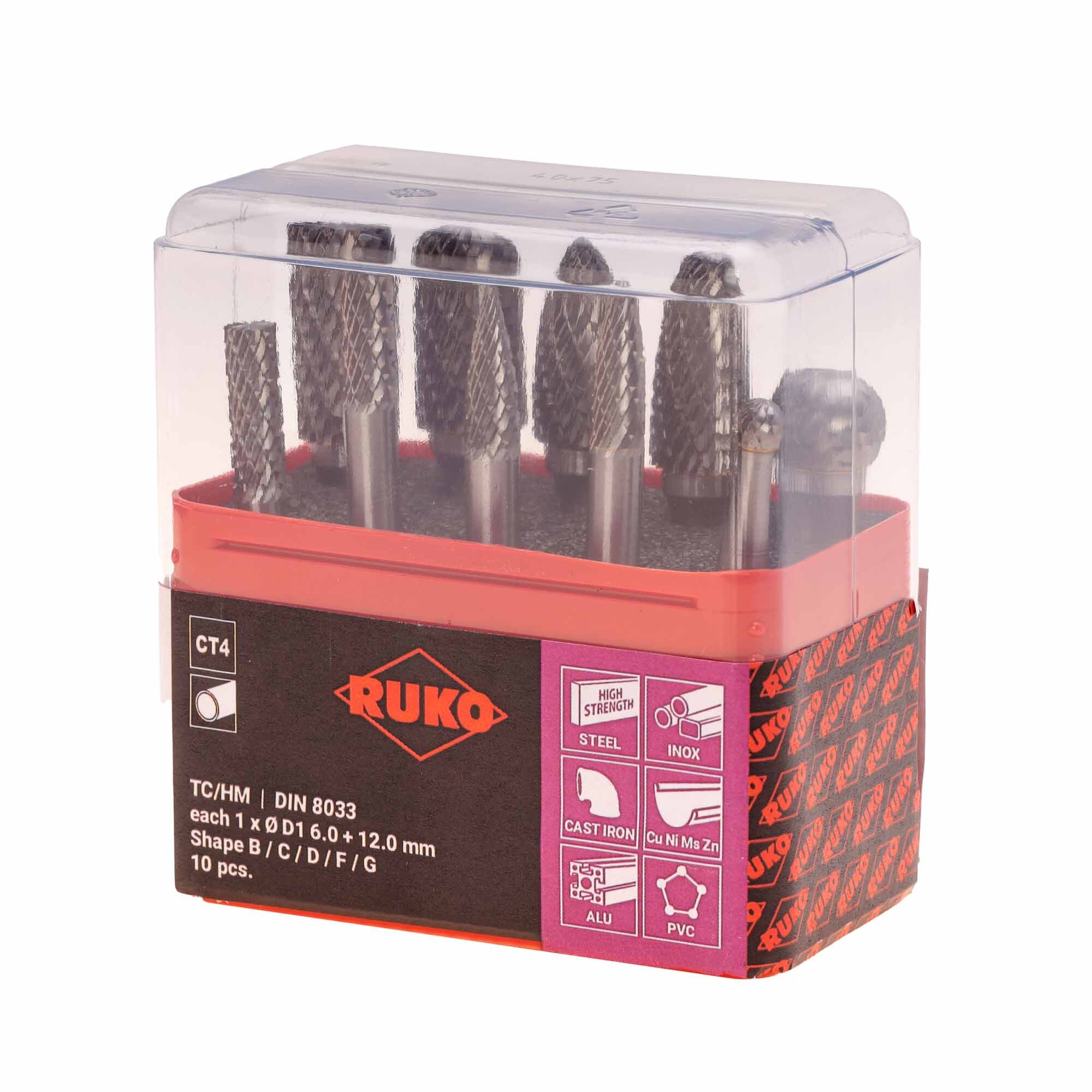 Набор из 10 твердосплавных борфрезов в мини-коробке каждый 1x Ø D1 6,0 + Ø D1 12,0 мм 2 фрезы формы B, цилиндр (ZYAS) с торцевым зазубрином 2 фрезы формы C, цилиндрической формы (WRC) 2 фрезы формы G, остроконечная дуга (SPG ) 2 заусенца формы F, круглая арка (RBF) 2 заусенца формы D, шарик (KUD).