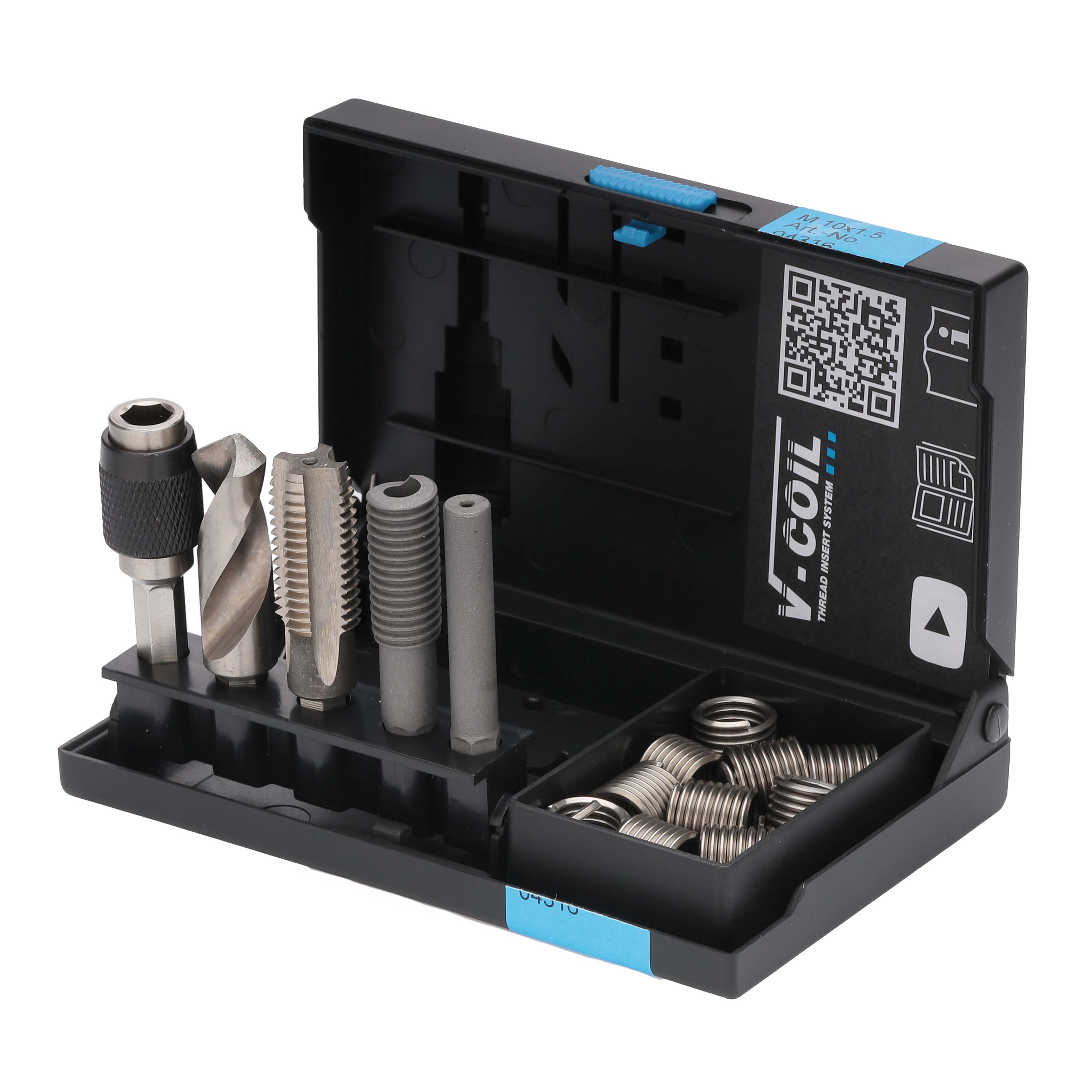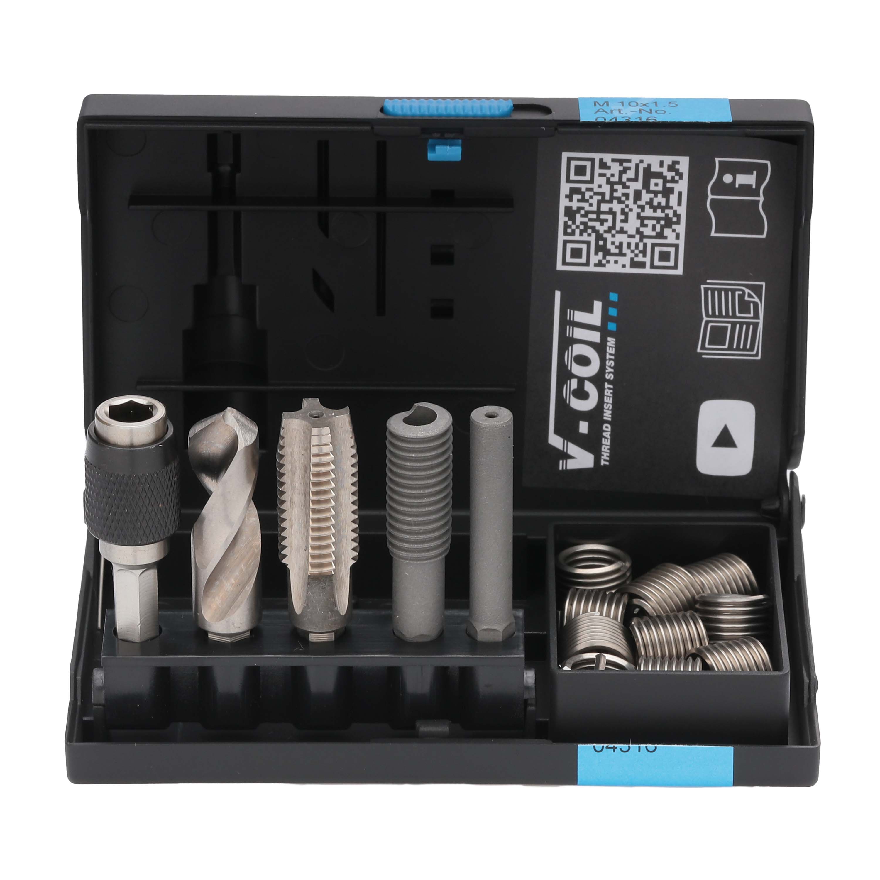 Держатель 1/4;Сверло с шестигранным хвостовиком 1 шт; Метчик STI для нарезания резьбы под вставку 1 шт; Инструмент для установки 1 шт; Боек для обламывания хвостовика вставки - 1 шт; Вставки с проволочной резьбой DIN 8140, допуск ISO 2 (6H), из нержавеющей стали, глубина 1,5xD, Тип S- M10x1,5 - 10 шт
