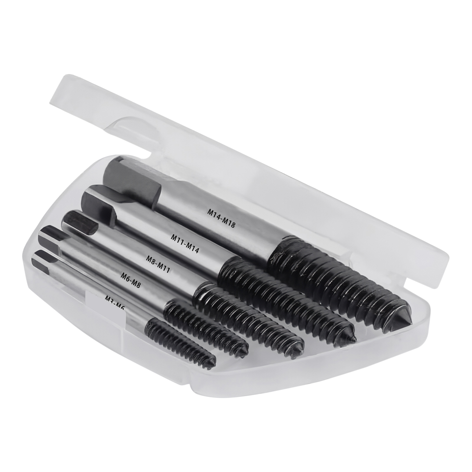 Набор экстракторов H-Tools, предназначен для извлечения сорванных или поврежденных резьбовых крепежных элементов (болтов, винтов, шпилек). Экстракторы подбираются по размеру, в соответствии с величиной поврежденного крепежа. Экстракторы изготовлены из хром-молибденовой стали 35CrMo и поставляются в удобном кейсе для хранения. Квадратный хвостовик позволяет прочно фиксировать экстрактор в воротке для метчиков.