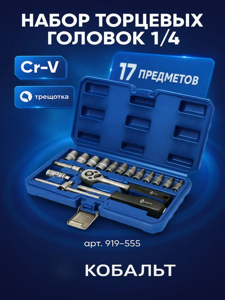 Комплект инструментов КОБАЛЬТ предназначен для профессионального использования в ремонте и строительстве. В набор входят головки торцевые диаметром от 4 до 13 мм (шаг 0,5 мм), шарнир карданный, удлинитель, отверточная и трещоточная рукоятки. Компактные габариты (ДхШхВ: 250x50x135 мм) и небольшой вес (0,89 кг) делают этот комплект удобным для переноски и хранения. Идеально подходит для выполнения различных ремонтных работ дома или на даче.