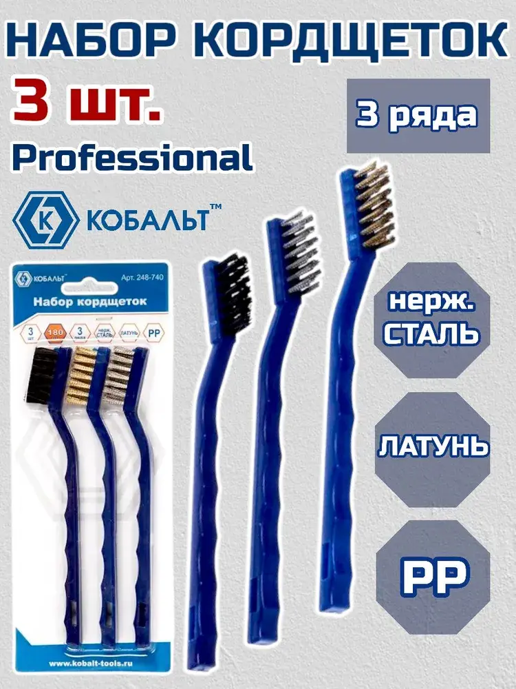 Набор кордщеток КОБАЛЬТ 180 мм (3 шт.), пластмассовая ручка (248-740) используется для зачистки металлических поверхностей от ржавчины, грязи, старых лакокрасочных покрытий и других загрязнений. Каждая щетка имеет щетину и удобные пластмассовые ручки. В комплекте 3 штуки.