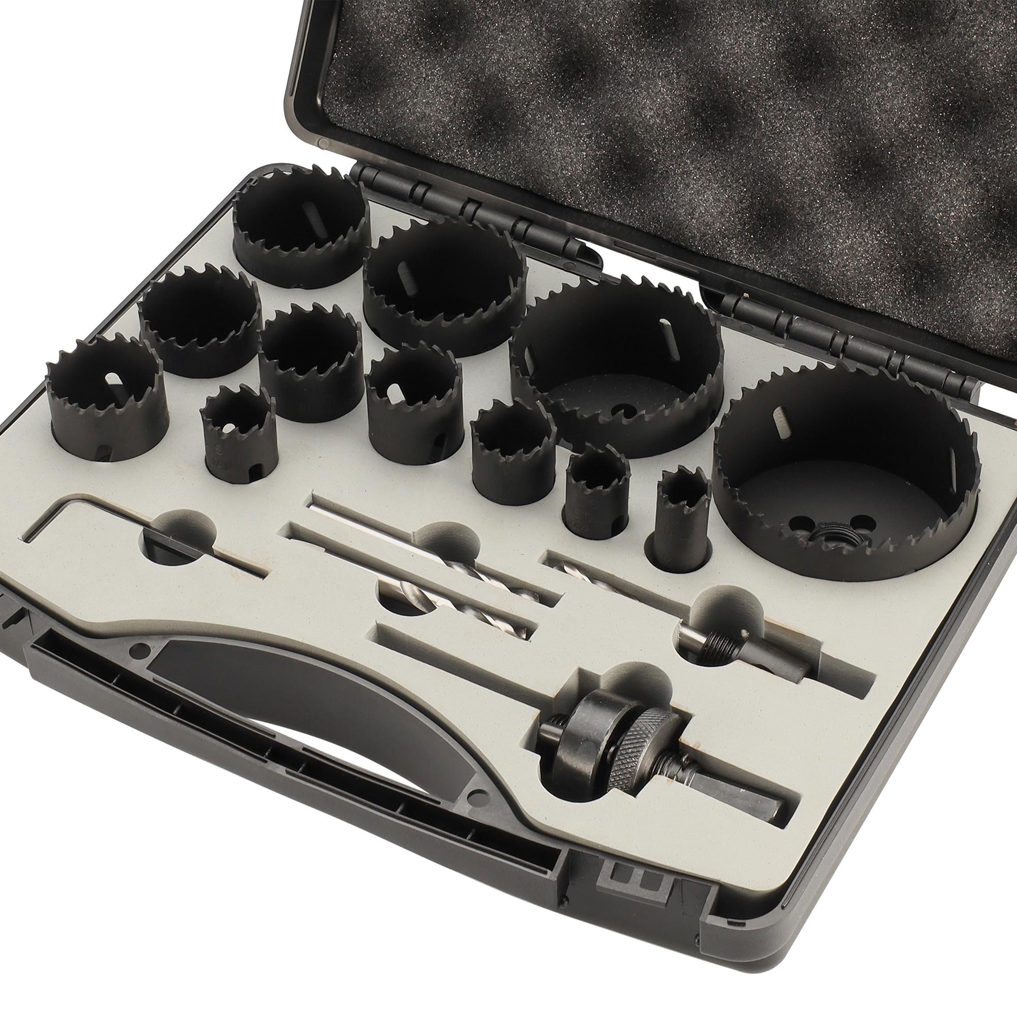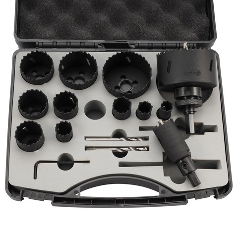 H-Tools Набор коронок Bi-metall HSSE-Co8, предназначен для сверления отверстий в легированной и низколегированной стали (до 1000 Н/мм2), нержавеющей стали, цветных металлах, а также по дереву, гипсокартону, ПВХ, МДФ и сэндвич-панелям. Применяется совместно с дрелями и сверлильными станками в безударном режиме.
