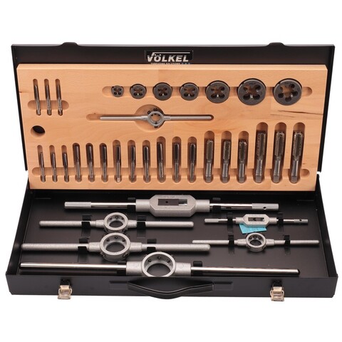 Набор метчиков и плашек BSW 1/4-3/4 HSS-G 35пр VOELKEL V48032 предназначен для создания внутренней и наружной дюймовой Английской резьбы Whitworth, с углом профиля 55 градусов.
