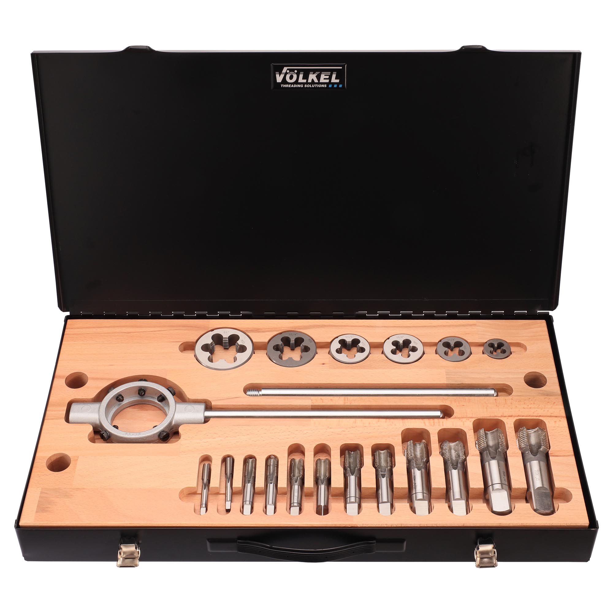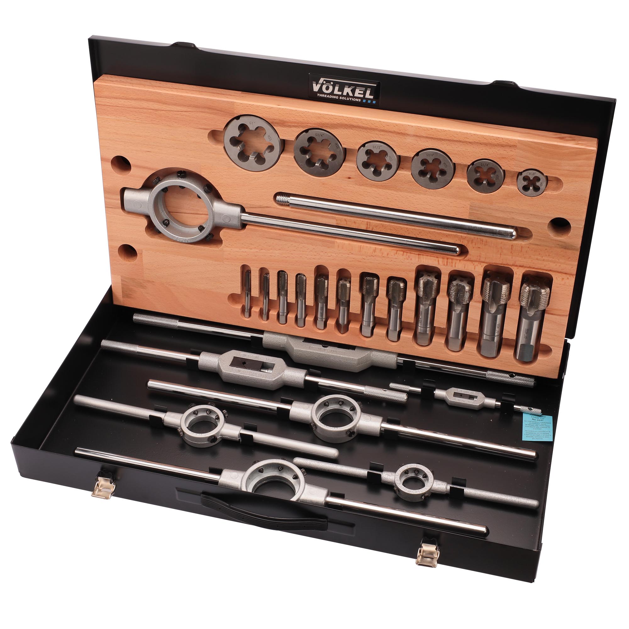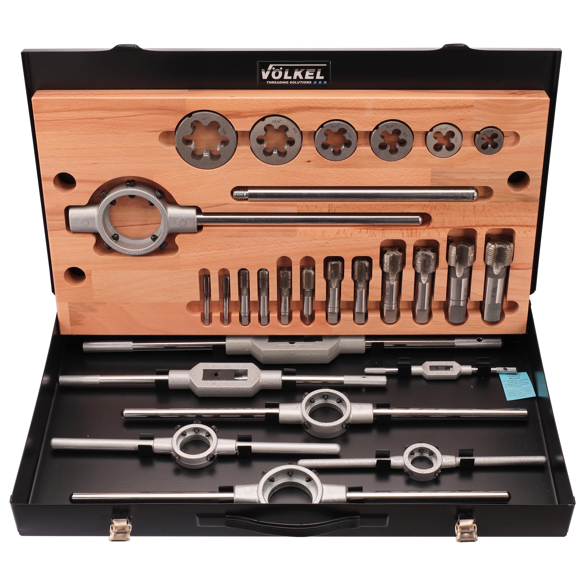 Набор метчиков и плашек G(BSP) 1/8 -1.0 HSS-G 26пр Volkel V48020 предназначен для создания внутренней и наружной резьбы в различных материалах.