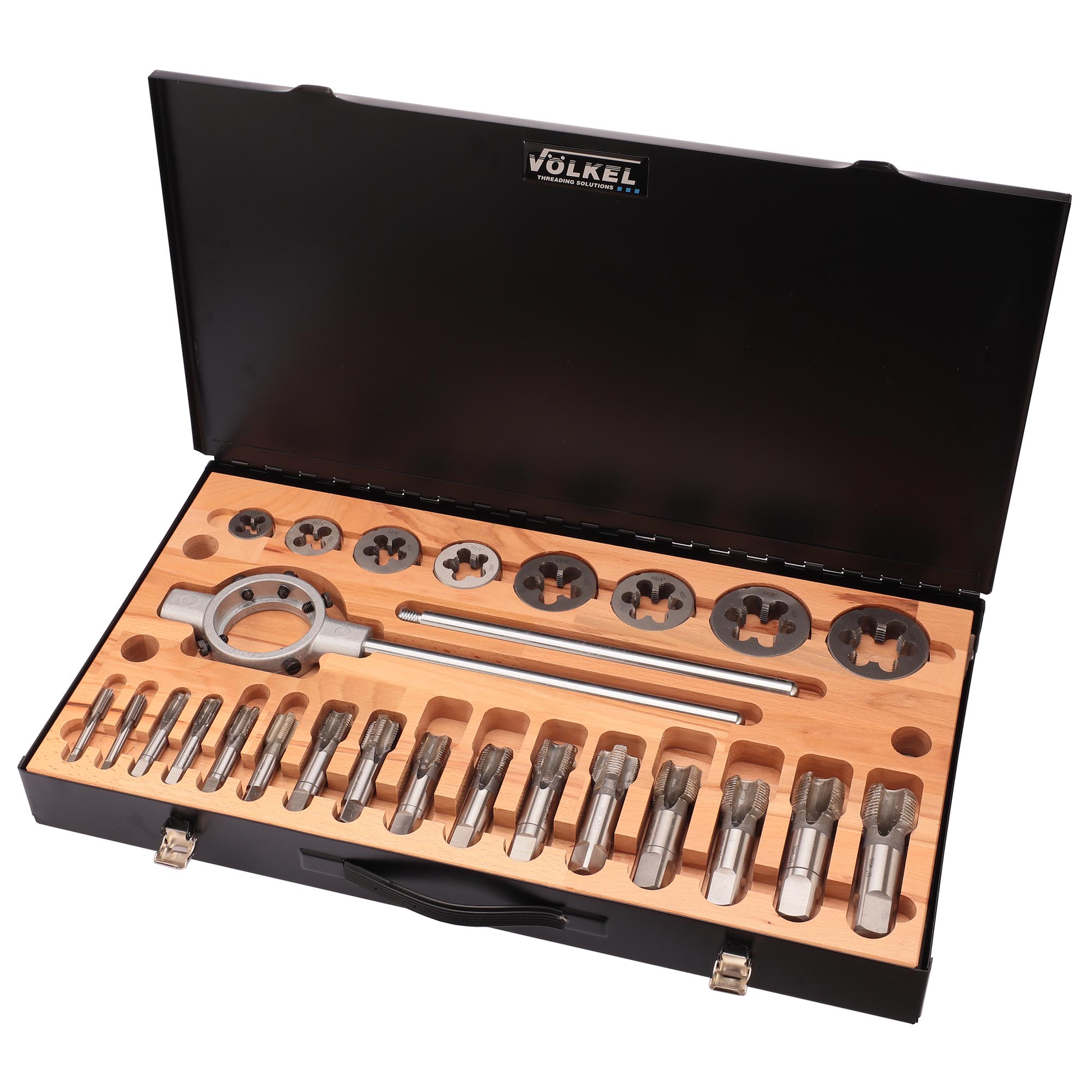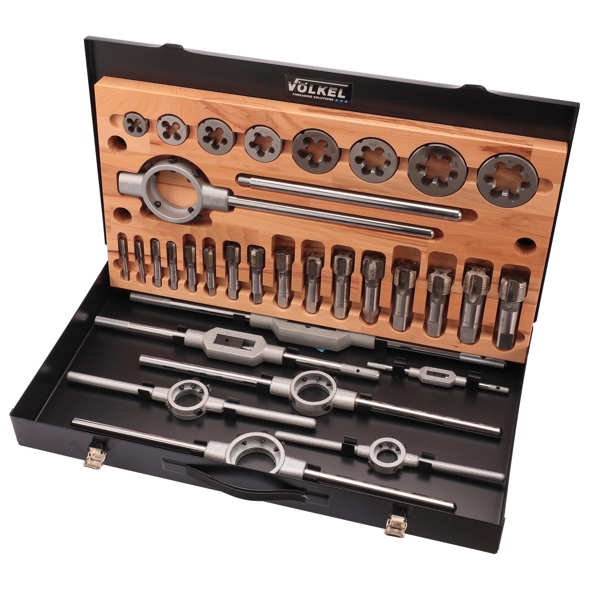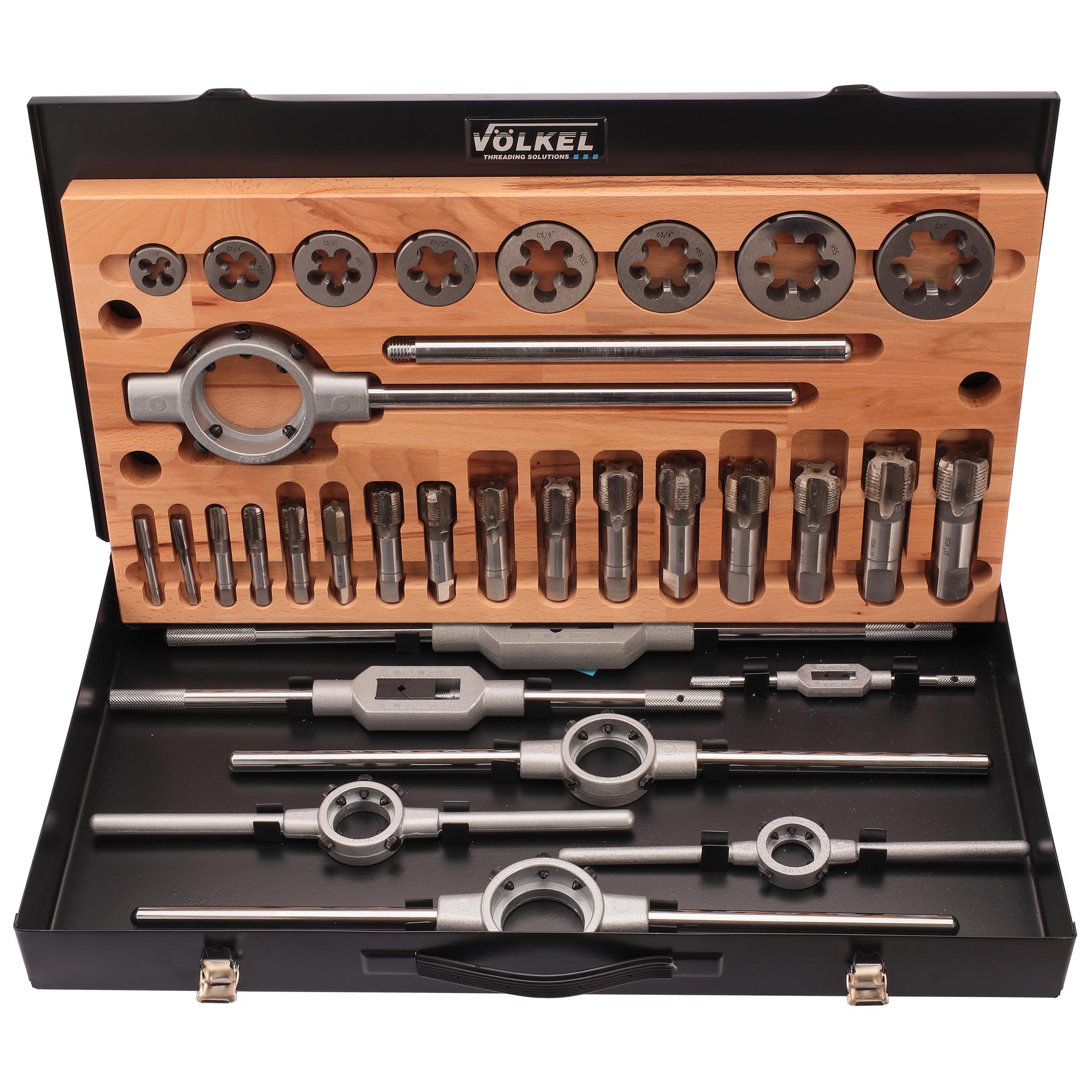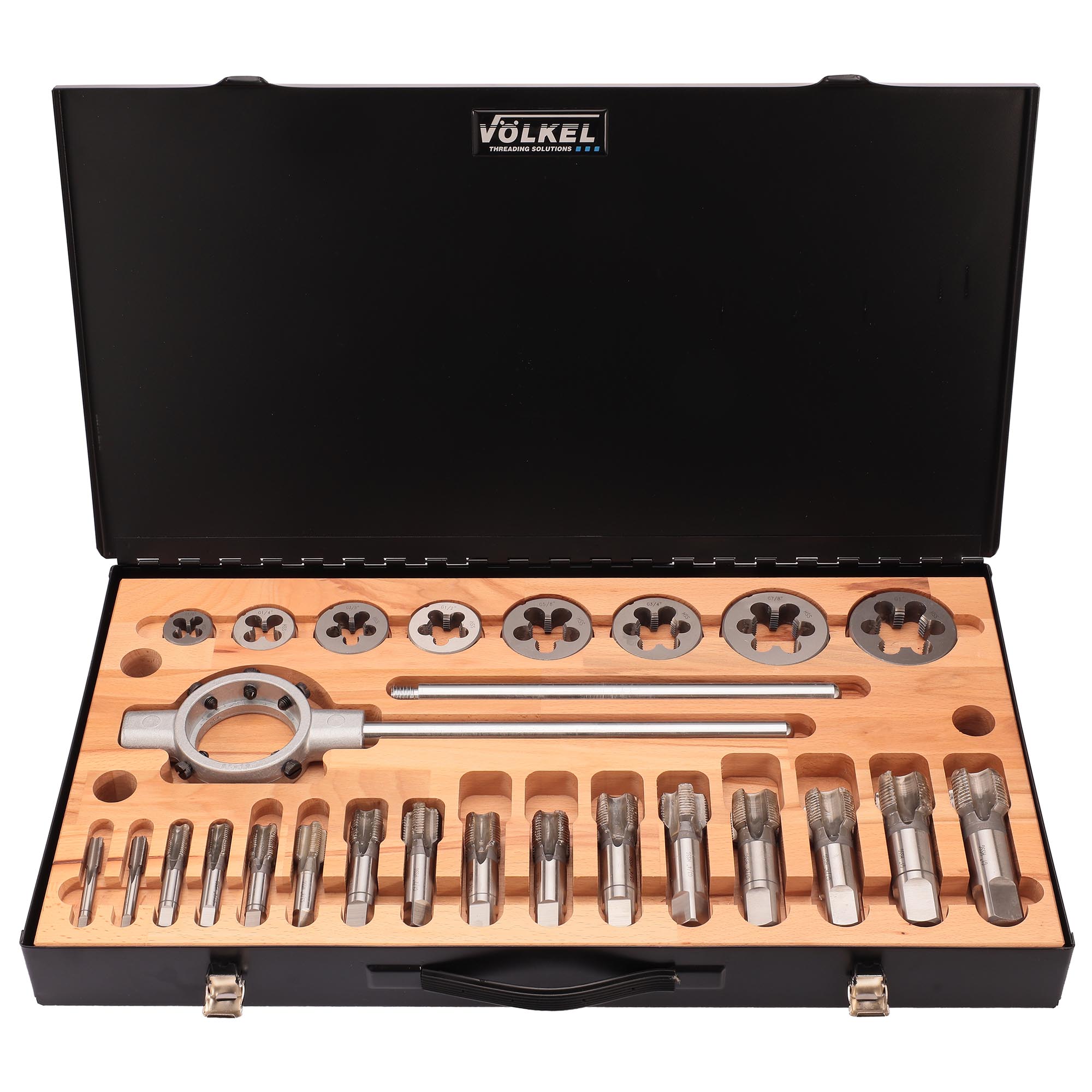 Набор метчиков и плашек G(BSP) 1/8 -1.0 HSS-G 32пр Volkel V48021 предназначен для создания внутренней и наружной резьбы в различных материалах.