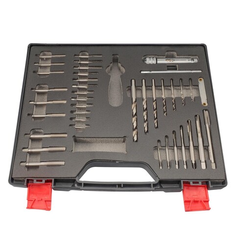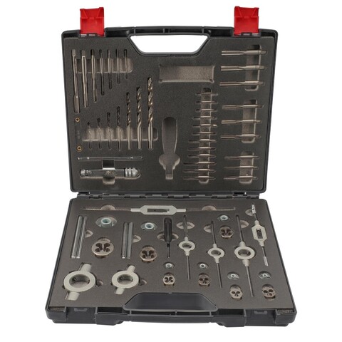 Метчики, плашки и сверла изготовлены из высококачественной быстрорежущей стали HSS-G, которая гарантирует прочность и износостойкость. Подходит для обработки заготовок, выполненных из низколегированной стали, чугуна, алюминия, меди, бронзы, цинка, с пределом прочности до 800MPa.