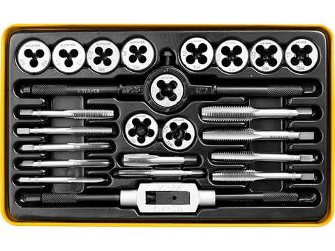 Набор метчиков и плашек STAYER "MASTER", метчикодержатель 1шт, плашкодержатель 1шт, метчики 11шт, плашки 11шт, 24 предмета