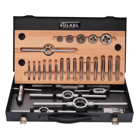 Набор метчиков и плашек UNC 1/4-1/2 HSS-G 28пр VOELKEL V48050, предназначен для создания внутренней и наружной дюймовой Американской резьбы UNC в различных материалах. Метчики и плашки изготовлены из высококачественной быстрорежущей стали HSS-G, которая гарантирует прочность и износостойкость. Подходит для обработки заготовок, выполненных из легированной стали, чугуна, алюминия, меди, бронзы, цинка, с пределом прочности до 900MPa.